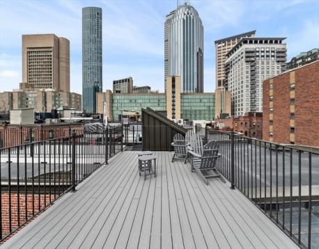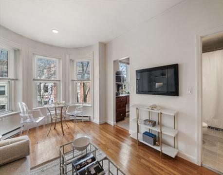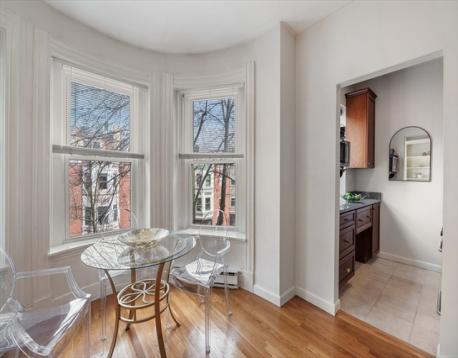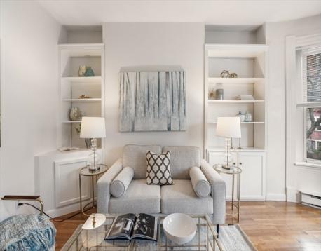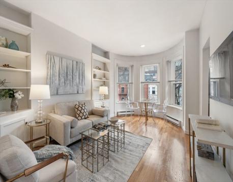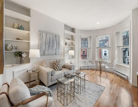 Set within the historic fabric of Boston, this attractive front facing one bedroom condominium offers a refined and efficient urban lifestyle. Thoughtfully maintained, the home showcases an intelligently designed kitchen where classic shaker cabinetry, sleek stone countertops, and a tasteful backsplash come together in a clean, sophisticated palette. The living area is enhanced by a large bay window, hardwood floors, custom built-in shelving, offering both functional storage and an elegant way to display books and personal pieces. The bedroom provides a quiet, private retreat with a double closet, while the full bathroom is well-appointed for everyday comfort. Residents enjoy access to a shared roof deck with sweeping city views, an ideal setting for relaxing or entertaining, along with the convenience of common laundry within the building. Ideally located just moments from Copley Sq, The Prudential Center and some of Boston's finest shops and restaurants.