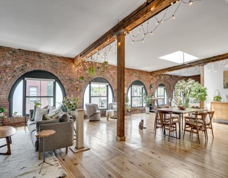 Stunning loft in the c. 1890 Carriage Building on Green Street in Jamaica Plain. This south-facing penthouse unit features exposed brick and heavy timber beams, numerous large arched windows, and original wood floors. Modern, high-end kitchen with white quartz counters, custom cabinetry, tiled backsplash, and Jenn-Air appliances. Designer bathroom with tile and warm wood accents. Fireplaced living room. Alcove bedroom with a deep walk-in closet, and office/seating area. Around the corner from the Southwest Corridor bike path, and the Orange Line at Green Street. Steps to celebrated eateries and cultural amenities on the Centre Street corridor and in Egleston Square. Entrance to Franklin Park two blocks away. Bicycle room, workout room, common patio with a grill, and extra storage in the basement. In-unit laundry. Assigned off-street parking.
