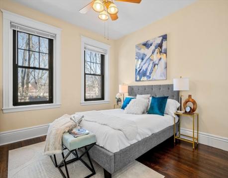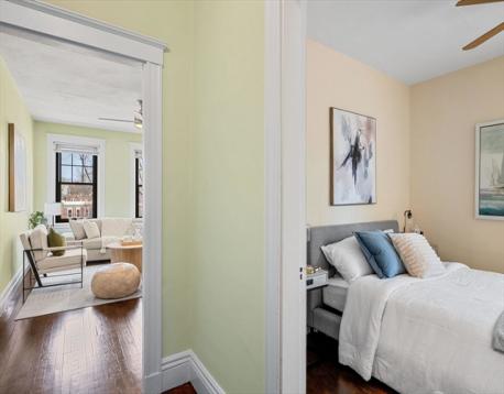 Perched atop a handsome brick building on Commonwealth's storied carriage road, this airy top-floor condo blends classic Brighton character with thoughtful modern updates. The eat-in kitchen is a home cook's delight: new stainless-steel appliances including a 4-burner gas convection range, French door refrigerator, and stainless-steel lined dishwasher, all within a generous sun-drenched eat-in dining space. The welcoming living room, with oversized windows framing treetop views, flows effortlessly into a dedicated dining space, ideal for entertaining or a quiet dinner at home. Flanking the living room are two generous bedrooms filled with natural light from two double pained windows, refinished hardwood floors, and ceiling fans making the spaces perfect for home office/guest room split or a peaceful primary retreat. Step onto your private iron-railed balcony and take in the sweeping neighborhood views. Prime location near transit and green space.