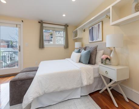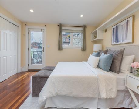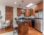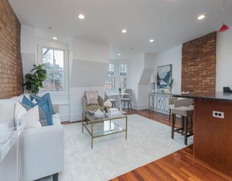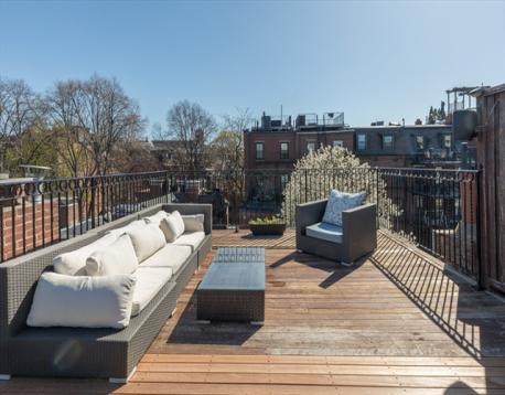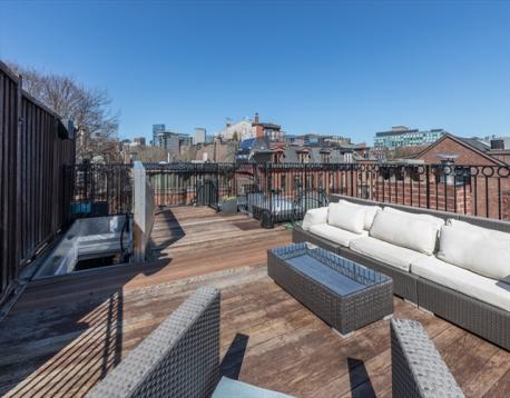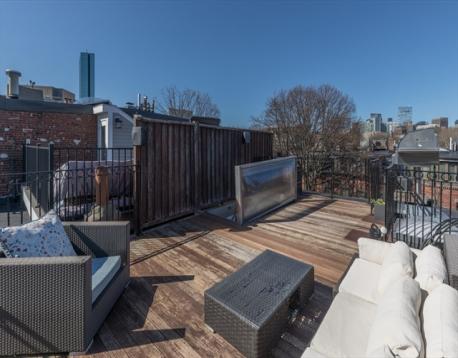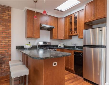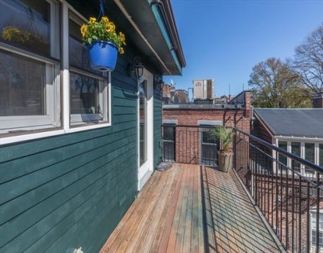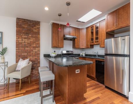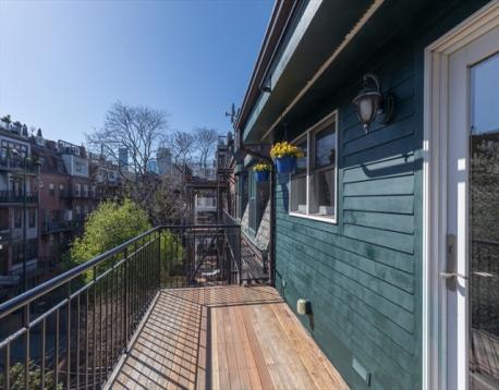 Located in the highly-desired Eight Streets area, this penthouse one bedroom occupies the entirety of the brownstone's 3rd floor. One flight of stairs leads to the unit entry where a 2nd flight ascends to the well-thought out & welcoming home. The kitchen with skylight allows for an abundance of natural light & is complete with granite island, plenty of cabinet space, & gas cooking. The kitchen opens to the front-facing living/dining area, graced with a bay window overlooking Dwight St & charming exposed brick. A full staircase provides access to the expansive private roof deck equipped with gas, water, & electricity. The rear of the unit is home to a generously sized bedroom with double closets & built-ins. A 2nd private deck lives off of the bedroom. The renovated bath features a walk-in stone rain shower & skylight. This home offers in-unit laundry, central a/c, & belongs to a professionally managed, pet friendly association.