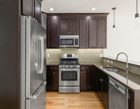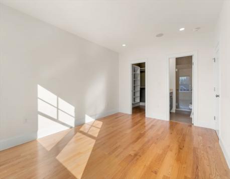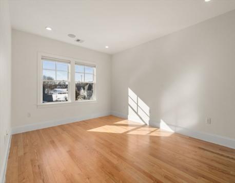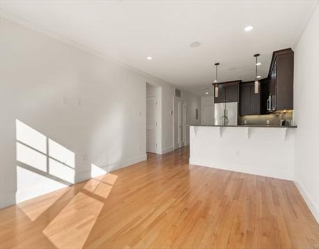 Enjoy upscale urban comfort in this bright two-bedroom, two-bath home perfectly situated in vibrant Roslindale Village. Expansive windows invite abundant sunlight while framing dynamic neighborhood views. Located in a stylish, professionally managed elevator building only a decade old, the residence offers a sleek open design accented by recessed lighting, detailed trim, and contemporary finishes. The gourmet kitchen features quartz surfaces, stainless appliances, a custom tile backsplash, and a spacious breakfast bar suited for entertaining. Two beautifully appointed baths include glass-enclosed tile showers, with a private en-suite serving the primary bedroom, which also offers a walk-in closet. A generous second bedroom provides flexible use. Additional features include central air, high-efficiency systems, built-in Bluetooth audio, in-unit laundry, and the convenience of one garage and one off-street parking space.