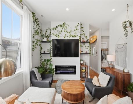 Welcome to 181 Cowper #302, a top-floor unit in one of East Boston's newest boutique condo developments, set at the end of a quiet dead-end street where a neighborhood park opens directly onto Constitution Beach.This 2-bed, 2-bath home is light-filled and open, with hardwood floors, quartz countertops, stainless appliances, a fireplace, central air, and in-unit laundry. The owner has made thoughtful upgrades throughout — updated fixtures and finishes, plus a fully upgraded master bath. Top floor means added privacy, better views, and a little more quiet. Walk to Constitution Beach, the East Boston Greenway, East Boston Yacht Club, Porrazzo Skating Rink, restaurants, and Wood Island MBTA. Downtown Boston and Logan Airport are minutes away. Two deeded parking spaces included. Newer construction. Top floor. Beachside living. This is the one.