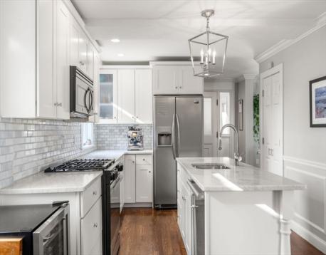 Rarely available 3-bedroom, 3-bath single-family home tucked away on a quiet Charlestown street. The main level offers a sun-filled, open-concept kitchen, living, and dining area with rich walnut hardwood floors, a gas fireplace, and sliders leading to a private deck and fenced yard. The chef’s kitchen features stainless steel appliances, custom cabinetry, marble countertops, an island, and pantry. The primary suite includes a walk-in closet and a renovated bath with a frameless glass shower, rainfall showerhead, and double marble vanity. A second bedroom, full bath, and laundry complete the second level. The top floor offers a spacious third bedroom with full bath—ideal as a guest suite, office, or playroom. Additional highlights include central A/C and a full basement with excellent storage.