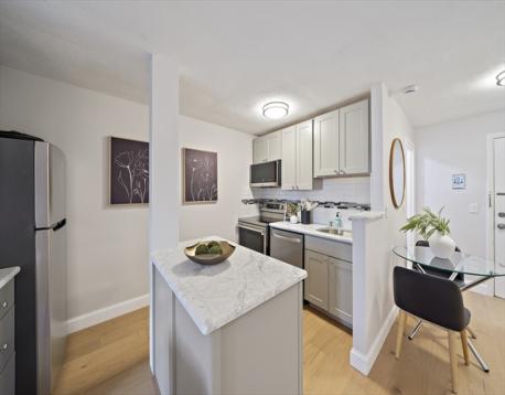 A fully renovated oversized studio with an off-street parking space in desirable Allston Location on a dead-end street walking distance to green line MBTA. Open flexible layout with three large closets, new floorings and new lights throughout. The kitchen has quartz countertops, new appliances including electric range/stove, microwave, fridge and disposal and ample cabinet space. The bathroom features custom detail, mirrored medicine cabinet, new vanity and tub/tile work. Professionally managed, well-maintained building with amenities including bike storage and common laundry.