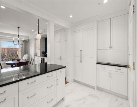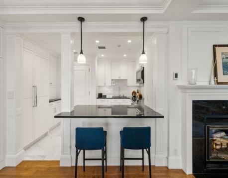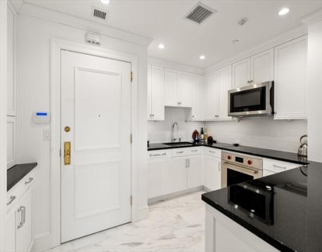 Welcome to the Residences at Rowes Wharf, adjacent to the iconic Boston Harbor Hotel. This full-service luxury building offers 24-hour concierge, valet parking, private storage, state-of-the-art fitness center, on-site restaurants, and optional room/maid service. This newly renovated one-bedroom home features an oversized living/dining area with hardwood floors, custom built-ins with integrated lighting, black granite countertops, coffered ceilings, wine refrigerator, and oversized windows showcasing city and harbor views. The chef’s kitchen includes marble tile floors, black granite countertops, abundant cabinetry, Sub-Zero refrigerator, Wolf oven, built-in microwave, and a large breakfast bar open to the living space. The spacious bedroom offers custom built-ins, high ceilings, multiple windows, and glass doors leading to a private balcony. The spa-like marble bath features a glass-enclosed shower, double vanity, cast iron tub, plus a marble powder room and in-unit laundry. Must see!