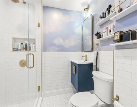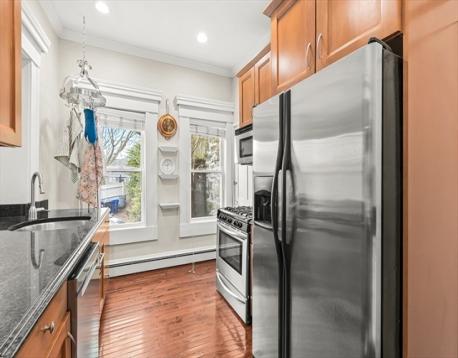 Located just off Monument Square, this oversized 1 Bed/1 Bath home boasts a coveted corner exposure and exceptional natural light throughout. The thoughtfully renovated kitchen features granite countertops, stainless appliances with gas cooking and is open to an elegant dining room with exposed brick wall, perfect for entertaining. The spacious living room with beautiful crown moldings, ceiling medallion and oversized windows overlooks the shared garden, while french doors lead to the spacious bedroom with sunny corner exposure and double closets. The recently renovated bathroom offers a walk-in shower and sleek floating vanity. Additional highlights include high ceilings, Brazilian cherry hardwood floors throughout, on-site laundry, and extra basement storage with exterior access. A fantastic opportunity to own a beautifully appointed home in a prime location.