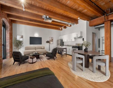 Amazing Space! Great Studio/1 Bedroom Loft at Fort Point Place, a professional, very well managed and maintained building just steps to fabulous restaurants, music, shopping and festivals in the Seaport. The Space is very open and spacious and lives larger than 776 square feet: separate Living, Dining, Kitchen and a Bedroom area. While the space remains wide open, a wall can easily be installed for additional privacy in the bedroom. Features include a Juliet Balcony, hardwood flooring, beautiful original refinished beams and high ceilings. Professionally managed, on site manager and very reasonable condo fees. Several convenient parking options nearby, and within steps of the front door. Most of the photos are enhanced with virtual staging.