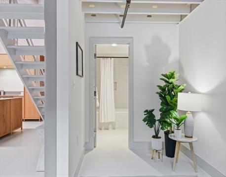 Morning light pours in the two-story windows as this spacious loft at the American Brewery Lofts comes quietly to life. Framed by soaring 18’ barrel-vaulted ceilings and set above a peaceful courtyard, the home blends authentic industrial character with refined, modern minimalism. The open, sun-filled layout invites long dinners, focused workdays, or unhurried afternoons at rest. A thoughtfully executed renovation introduces a bespoke kitchen with Danish oak cabinetry, custom stainless countertops, premium Miele appliances, and a sculptural island designed for gathering. Two spa-inspired bathrooms feature volcanic limestone soaking tubs, artisan tile, and European fixtures. The serene primary suite, finished with wide-plank heart pine floors, offers remarkable quiet and calm. With central air, garage parking, private storage, a fitness center, garden patio, and grills, this residence delivers elevated urban living just moments from Longwood, Jamaica Pond, and the heart of Jamaica Plain