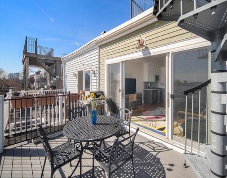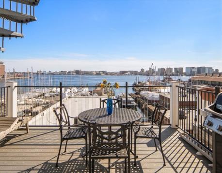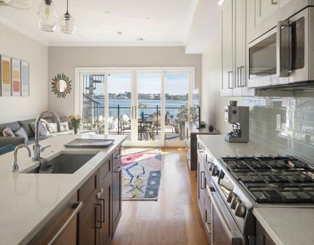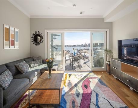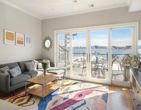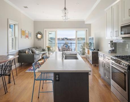 Experience the best of Jeffries Point waterfront living just in time for summer in this beautiful 2 bed 2 bath penthouse on the harbor facing side of coveted Webster Street. The open concept living room and kitchen features quartz countertops, a large center island, stainless steel appliances, and excellent storage. The spacious primary suite boasts a walk-in closet, modern bathroom with shower/tub. The second bedroom can easily accommodate a queen-sized bed or double as a home office/exercise space. Professionally managed and additional basement storage. Two private decks, one off the living area perfect for sipping morning coffee and the other being an amazing roof deck offering commanding unobstructed views of Boston Harbor and the city skyline. Short walk to the waterfront jogging path, stunning Piers Park, restaurants/café/bars such as Aloe Natural, TallShip, and The Reelhouse. Easy walk to Maverick Sq. T and the water ferry landing for quick access to downtown Boston/Seaport.
