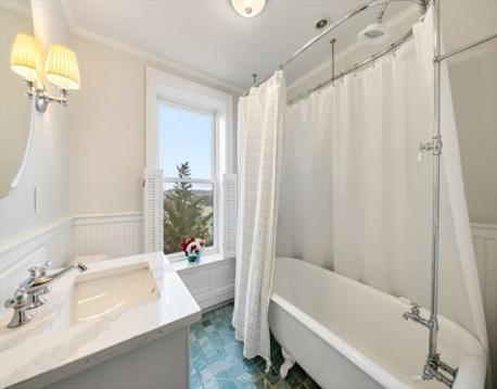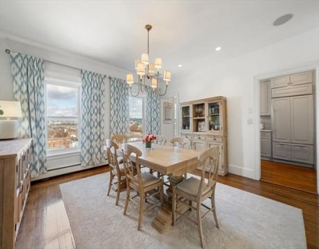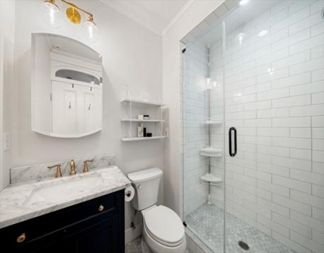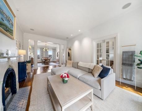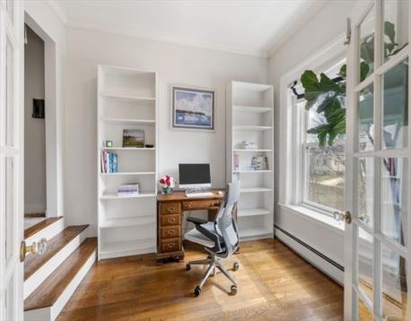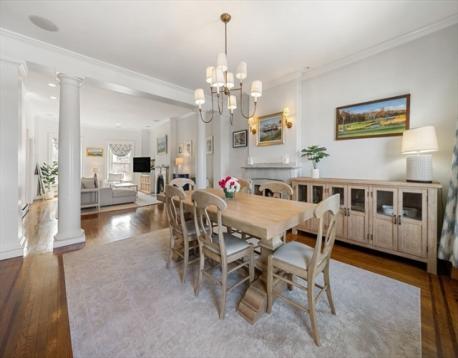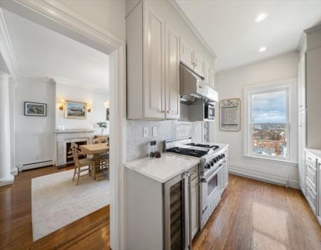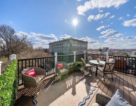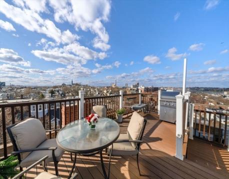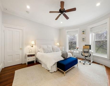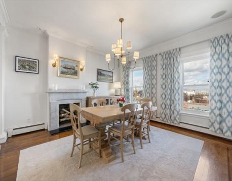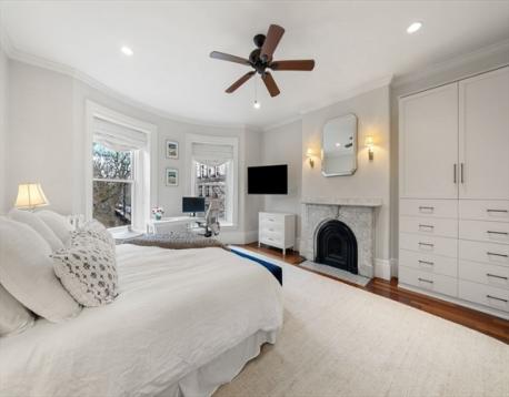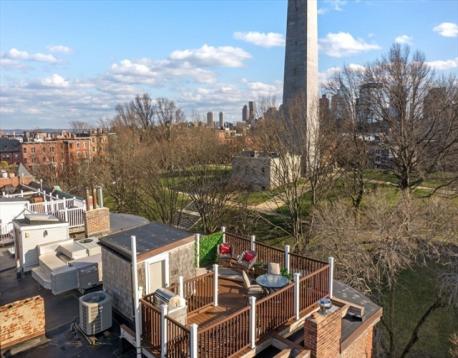This spectacular, 3+BR/2.5BA, penthouse duplex is well located on Monument Square in a handsome brick bow front townhome, and offers 1785sf of beautifully renovated space, a private 250sf roof deck with sweeping views of the Bunker Hill Monument and city skyline, a common yard and 1 car parking. This rare find features a sunny southwest exposure, an elegant front to back living/dining space with two marble mantels, fireplace, striking columns, office with French doors, and half BA. The chef’s kitchen offers high-end Viking and SubZero appliances, including wine fridge; quartz countertops, herringbone marble backsplash and ample cabinetry. The spacious primary bedroom, with walk-in closet, ensuite bath with marble topped navy vanity, and frameless glass shower with marble tile flooring, offers incredible Monument and park views. A large rear bedroom with custom closet and adorable nursery are serviced by a full bath with clawfoot tub. C/Air, storage, 100% owner occupied.