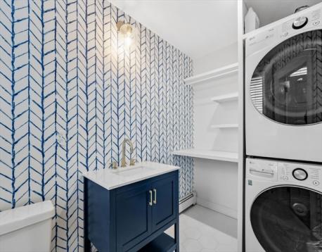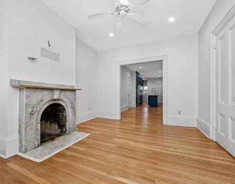 Sunlit 2BD/1.5BA, bi-level apartment in a brick row house with fantastic kitchen, en-suite laundry plus open living concept available now. This spacious dwelling features hardwood floors, tall ceilings and ample closet space. The living room, with plantation shutters, can accommodate large furniture and television. The showpiece of a kitchen features beautiful custom cabinets, gleaming quartz counters and an island with oversized sink and seating for 4+. A renovated half-bath with laundry completes the first floor. The ground level features two bedrooms with good closet space plus a renovated bathroom with walk-in shower and glass enclosure. A a private fenced outdoor area is the cherry on top! Available now. First, last, security fee.
