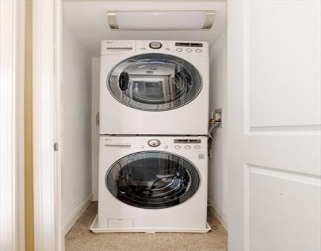 Welcome to this beautifully appointed 2-bedroom, 2-bath condo offering modern style and comfortable living. Located on the second floor, this bright unit features 9’ ceilings and walnut-stained hardwood floors throughout. The open-concept kitchen and dining area showcases solid white cabinetry, granite countertops, and a center island with seating for three, complemented by stylish pendant lighting and stainless steel appliances including Bosch and Samsung. The living room offers recessed lighting and sliding glass doors that open to an expansive private deck, perfect for relaxing or entertaining. Two well-sized bedrooms include a corner primary suite with walk-in closet and en suite bath with glass enclosed shower. Adjacent to the 2nd bathroom is the in-unit laundry with full-size LG stackable washer and dryer. Two tandem driveway parking spots are a wonderful bonus. Great location, 5 minutes from Green St. T. along with a vibrant mix of neighborhood restaurants, cafés & shops!