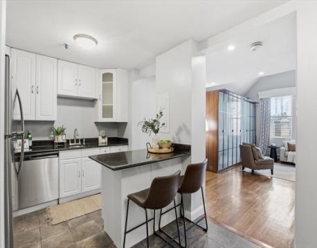 You could move right into this terrific studio with a sleeping loft in a prime South End location! This upper level open concept unit lives larger than its square footage and has no wasted space. It offers a modern kitchen with white cabinets, stainless appliances, dark granite countertops and a breakfast bar great for entertaining or casual eating. Next to the kitchen is a great space for dining or a home office. The living room features a high lofted ceiling, a wall of storage cabinets, downtown views, dark oak hardwood floors and recessed lighting. A spiral staircase takes you up to the sleeping area which easily accommodates a queen sized mattress. The building is professionally managed, has healthy reserves and includes an elevator, common storage, laundry and a bike room. This home is an excellent opportunity for an owner occupant or an investor. Terrific location close to restaurants and shops in the South End with easy access to Back Bay and the MBTA.