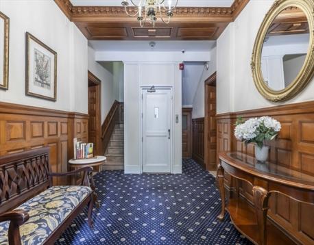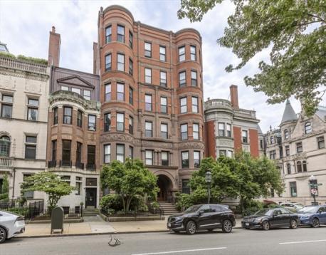 Commonwealth Ave Mall views • 3-bed floor-through with elevator. Sun-filled, 4th flr, 1,940 SF floor-through on a single level, with three exposures overlooking the tree-lined Commonwealth Avenue Mall. Rare Back Bay elevator building. Renovated 3-bedroom plus separate study/home office (ideal as guest room or flexible space), and two spa-like marble baths, one with a jetted tub. Grand living room with 10' ceilings, three floor-to-ceiling bow windows, fireplace with original mantle, crown moldings, and hardwood floors throughout. Eat-in kitchen with stainless steel appliances and gas cooking opens to a formal dining / family room with a second fireplace, wainscoting, and bar area. Central A/C, in-unit washer and dryer, private storage included. Set one block off Newbury Street and near the Public Garden, Copley Place, Prudential Center, Charles River Esplanade, Symphony Hall, and Green Line service at Hynes Convention Center and Copley. Rental parking nearby