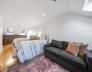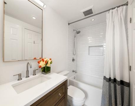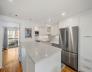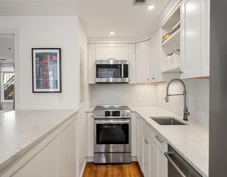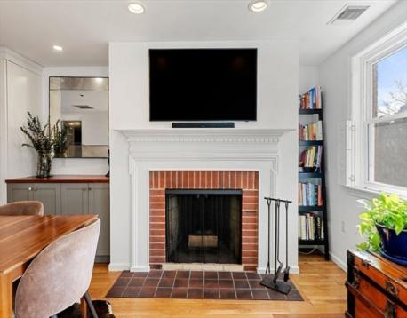 This spacious 3BR/1.5BA, 1473sf, penthouse duplex is located in the heart of the gas light district near City Square Park. The main living level has a wonderful open layout between living, dining and kitchen areas – perfect for entertaining. The spacious living room features a sunny Southwest exposure, wood burning fireplace and handsome mantel, and flows to the elegant dining area, complete with custom built-in hutch - great for storage and food service. The sleek kitchen features a large quartz topped peninsula with storage, stainless appliances, white cabinetry and penny tile backsplash. A well-appointed half bath, and spacious bedroom with large, custom walk-in closet, and egress to a deck, complete this level. The top floor primary bedroom features a custom walk-in closet and offers a two-tiered deck with views up to Training Field Park area and the Monument. An additional oversized bedroom features built-in cabinetry and 4 skylights. In-unit W/D, C/Air and private storage.