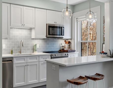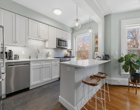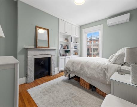 Beautifully renovated, classic bow-front 2-bedroom overlooking the center of sought-after Union Park! Entry hall leads to a lovely living/dining room with fireplace and windowed bow front, offering beautiful views of lush green space and fountains. The newly renovated, open kitchen features a breakfast bar, ample cabinet space, a separate pantry, and a large window. Gorgeous bathroom with high-end fixtures and a deep soaking tub. Two real bedrooms in the rear—one with custom built-ins and marble mantel, the other with exposed brick and access to a sunny private deck. In-unit washer/dryer, AC via mini-splits, and hardwood floors throughout. Rarely available offering in one of the South End’s most sought-after locations. A restful oasis close to shops, restaurants, public transportation and more.