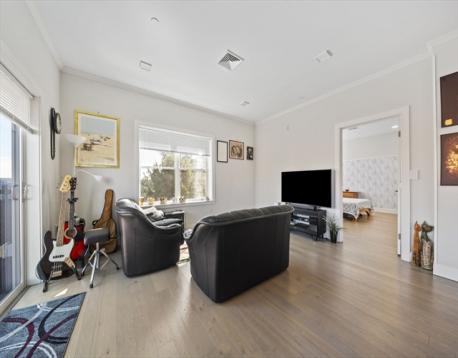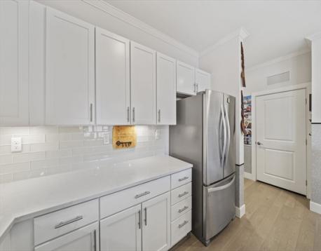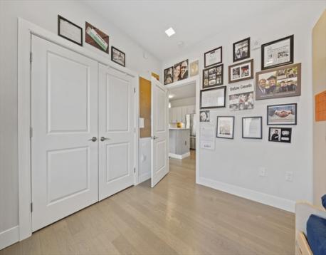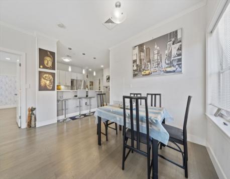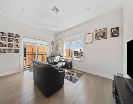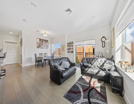 Unit 409 is a modern 2-bedroom home in an elevator building with street-level garage parking. This bright residence features hardwood floors throughout, crown molding in the living and dining areas, recessed lighting, and a sliding door to a Juliet balcony. The kitchen offers quartz countertops, glass tile backsplash, Portrait Square cabinetry, stainless steel appliances, and in-unit washer and dryer. The primary bedroom includes a walk-in tiled shower, and there is an additional full bath featuring a tub/shower. Conveniently located minutes from Maverick MBTA Blue Line Station, Piers Park, restaurants, MBTA regular ferries to the Boston Seaport District and the city, direct access to the Airport area and LOGAN Food Market (24/7) from a special entrance at the end of Maverick St., and a short distance to Logan Rental Car Center Airport Shuttles to all terminals.