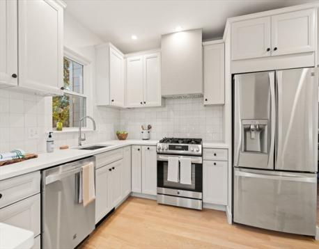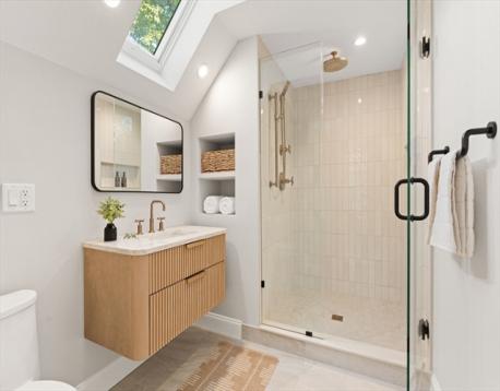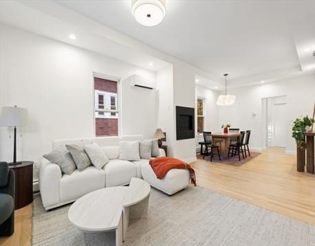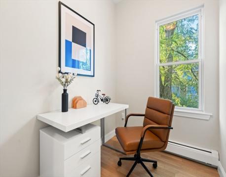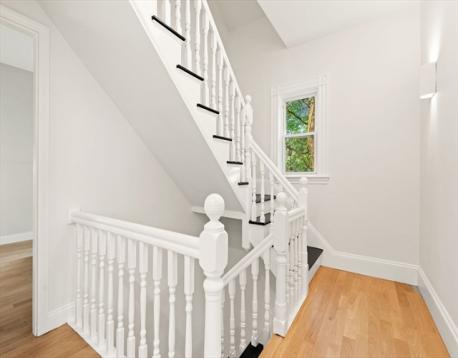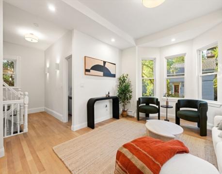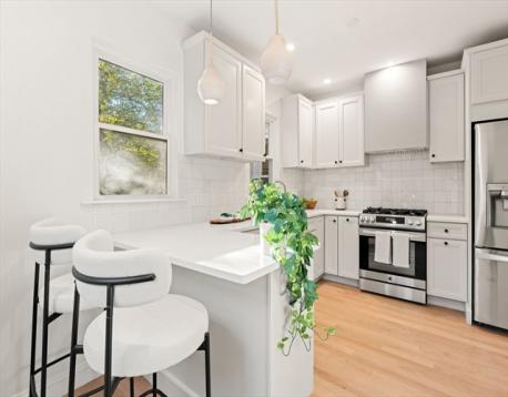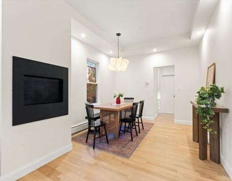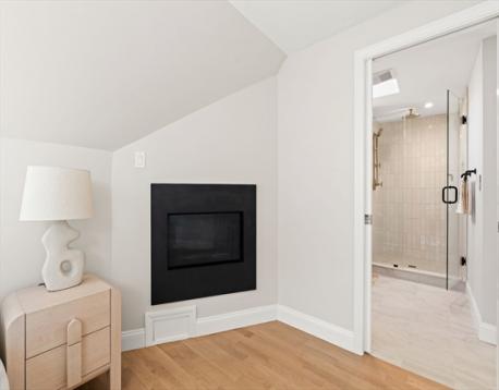 Uber stylish, bi-level condo with 2 beds + study, 2 baths, tucked away on a side street in JP. Located just mins to the Arboretum, Centre / South St. shops, Forest Hills station & Jamaica Pond! Mid-century modern vibes blend many cosmetic updates such as refinished oak flooring, high-end fixtures & lighting, + central air. The living area welcomes you w/ an open layout, bay windows, high ceilings & sleek gas fireplace. Gorgeous kitchen has Kenmore Elite appliances, tiled backsplash, and custom hood fan. The main level also includes one bedroom, convenient study, in-unit laundry room, & stunning tiled bath featuring a floating vanity. Relax in your luxurious top floor suite among skylights, a second gas fireplace, custom walk-in closet, and glass shower w/ Kohler Purist fixtures. Unit also has a mudroom, private patio, walkout basement + large prvt storage room. This was a 2015 full reno & 2025 refresh, and is a new condo conversion offering 2 units. Don’t miss this exceptional home!