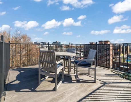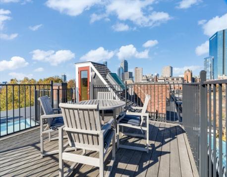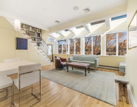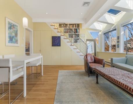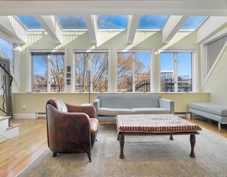 Rare opportunity to make this spectacular fountain facing 2 bed Union Park penthouse your next home! Enter the oversized living room and your gaze will be drawn to the dramatic wall of windows that extends across the breadth of the space, with the full expanse of glass complimented by skylights that wrap onto the ceiling. The LR/DR area is further enhanced by custom built-ins, hidden storage, and integrated speakers. Hardwood floors and designer lighting throughout the home. The cherry-wood kitchen by Payne Bouchier features black granite counters, Sub-Zero and Viking appliances, and light-blue ceramic pavers. Yet another of 9 skylights anchors the kitchen, this one fabricated in stained glass by South End artist Jim Anderson. The marble-clad bath features a heated Jacuzzi tub and blue-glass detailing. 2 park facing BRs, including a bow front primary with bucolic views. Upstairs, a head house opens to a private roof deck from which the full 360-degree skyline panorama can be enjoyed.
