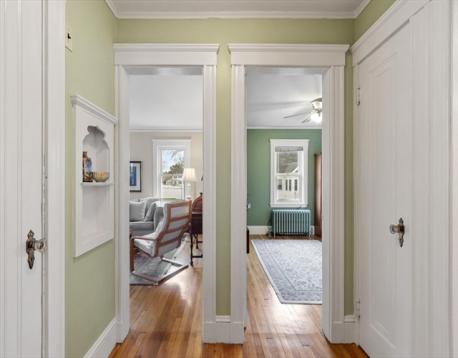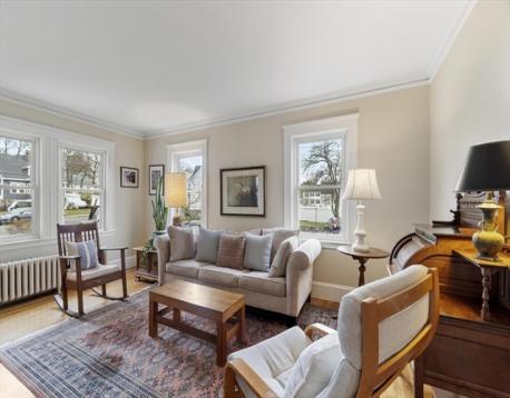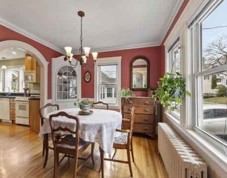 Discover the oasis at 34 Addington Road, a lovingly maintained corner-lot Cape in the coveted Brook Farm neighborhood. This 3-bed, 1.5-bath gem perfectly blends classic New England charm with modern comfort. The heart of the home is an expansive kitchen featuring a center island, hutch, and a garden window perfect for your indoor herbs. Entertain in the elegant dining room, accented by a built-in corner cabinet & timeless wainscoting. Relax in the sun-drenched living room, a true sanctuary awash in natural light with a cozy fireplace. A versatile third bedroom (or den) and a half bath round out the first floor, while upstairs offers two generous bedrooms and a full bath. The basement provides plenty of storage & laundry. Outside, enjoy a manicured yard, welcoming front porch, private deck, and 1-car garage. Nestled on a quiet street less than 1 mile from the Commuter Rail, Trader Joes, Roche Bros, and many restaurants & shops! Join us for an open house or schedule a private showing!