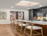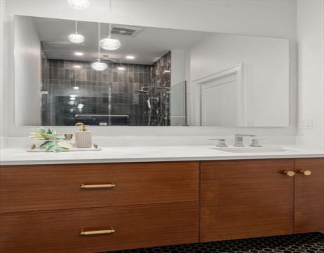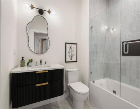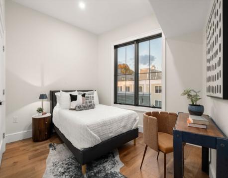 This stunning BRAND NEW top floor penthouse condo was designed in perfect balance—functional, modern, and effortlessly warm. Flooded with natural light with oversized Marvin windows, this home features a custom chef's kitchen with Taj Mahal quartzite countertops, and a stand-alone island that has a dramatic skylight by Marvin with smart capabilities. It showcases a premium Thermador appliance suite with induction range, custom cabinetry with real brass knobs and handles, and a bridge faucet. Highlights are the wide-plank white oak flooring, which is much higher than the usual developer grade, custom-tiled baths with Duravit fixtures, the primary shower features thermostatic shower system by Grohe. and a thoughtful floor plan elevating the home’s refined character. The property’s unique angled layout provides exceptional natural light, and dramatic sunsets. The deck from the living room is made of mahogany, with garage parking and a fenced patio space completes exceptional offering.