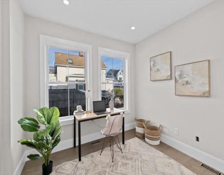 Welcome to this stunning contemporary condo in West Roxbury’s desirable Brook Farm neighborhood. This modern home features 3 spacious bedrooms, 2 full baths, and 2+ driveway parking spots. The chef’s kitchen offers top-of-the-line appliances, custom cabinetry, quartz countertops, and elegant backsplash finishes. A bright open layout with 9” engineered hardwood flooring adds warmth and sophistication. The lighted staircase leads to a private lower-level primary suite with an adjacent living area and laundry room. Enjoy a large yard and stone patio perfect for entertaining. Additional highlights include a stucco exterior, 9-ft ceilings, high-performance windows, metal roof, and 30-year lifetime IKO roofing system. Combining luxury, comfort, and efficiency—this home is a must-see!