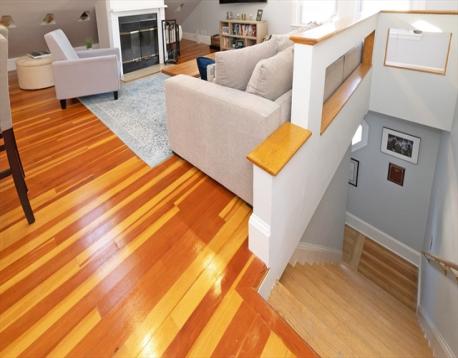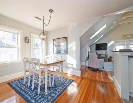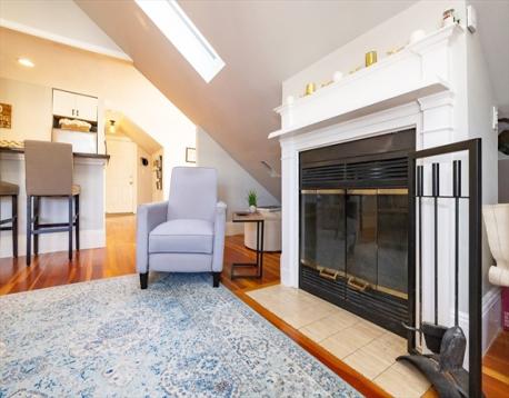 Top-floor 2-bedroom condo in a prime Dorchester location—bright, airy, and move-in ready. The open-concept layout features vaulted ceilings, skylights, and a wood-burning fireplace, flooding the space with natural light. Both bedrooms are generously sized with built-out closets, sharing a bath between them. Storage abounds: walk-in closet in the primary, large pantry, oversized HVAC closet, and a dedicated basement storage room. Central A/C, 1 outdoor + 1 garage parking spot, and in-building laundry add everyday convenience. Unwind or entertain in the expansive shared backyard. Unbeatable location—short walk to the Red Line at Ashmont, Adams Village dining and cafés, quick access to I-93, and the Neponset River Trail make this the perfect location.