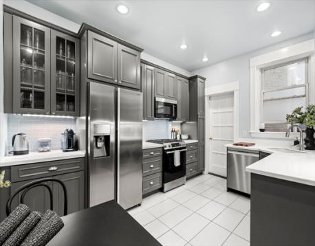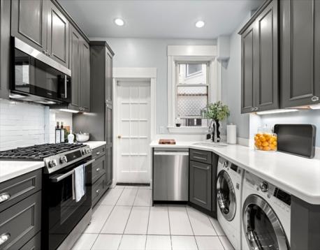 Enjoy the incredible light and beautiful views of the Back Bay skyline in this sunny side Commonwealth Avenue pre-war condominium. Located in an elevator building, this 2-bed, 1 bath residence is steps from the Charles River, Prudential Center and Newbury Street. A gracious entry foyer leads into a large, flexible use room with a fireplace, wainscoting, built-in bookcases, and an office nook. The South-facing main room is adorned with four large windows that flood the space with bright sunlight creating a warm, welcoming ambiance. The updated, eat in kitchen boasts incredible storage, new stainless Bosch range, microwave, and dishwasher, white quartz countertops, tiled backsplash and washer and dryer. The primary bedroom overlooks the Commonwealth Avenue Mall and has two large closets with storage above. There is an adjacent office with lots of storage.The tiled bath has a tub and pedastal sink. The common roof deck is one flight above and also overlooks the Mall.