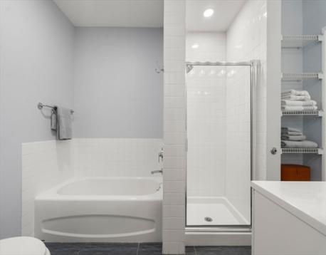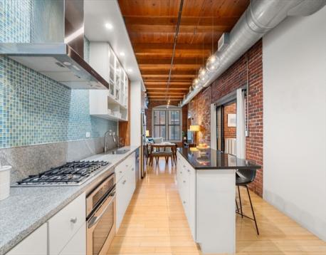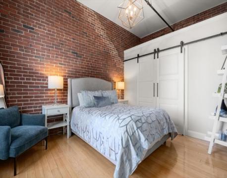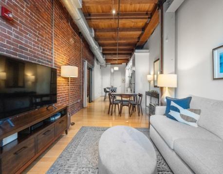 Welcome home to this exceptional brick & beam 1+DEN loft in highly sought after Seaport building. Soaring ceilings and oversized windows flood the space with natural light and offer views of Channel Center St and downtown Boston. Updated kitchen features s/s appliances, breakfast bar w seating for four, and dedicated dining area. Spacious primary bedroom accommodates king size bed and custom walk-in closet. Versatile Den is outfitted w custom sliding door and wall-to-wall custom built-ins, ideal for home office or guest space. Thoughtful upgrades include fresh paint, bathroom/kitchen renovations, and lighting. Additional highlights include in-unit washer/dryer, central air, and monthly rental parking available across the street. Tucked away on a quiet street yet moments from the best in Seaport and South Boston, this is urban loft living at its finest. Convenient access to public transportation, South Station, Amtrak, major highways, Logan Airport.