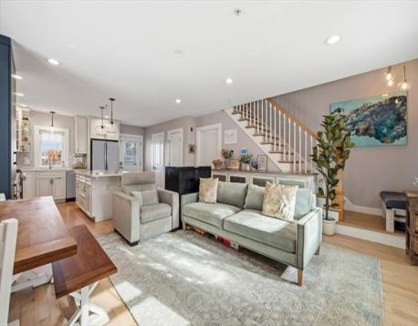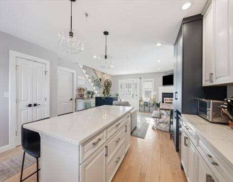 Tucked in Southie’s most anticipated area, this 3 bed, 2.5 bath townhome spans four floors of living. Through 2 private entrances, front and back, step into the open-concept main level featuring newly refinished hardwood floors, a gas fireplace, and a kitchen with white shaker cabinetry and newer stainless steel appliances. A built-out pantry/coat closet & half bath complete the space. The second floor offers 2 well-sized bedrooms, both with double-door closets, a newly renovated full bath, and full-size laundry. Upstairs, the oversized primary suite is bright and inviting with a massive walk-in closet and beautifully renovated bath with glass-enclosed shower and double vanity. Enjoy 3 outdoor spaces including a shared patio/side yard, private balcony off the second bedroom, and private roof deck with superb downtown Boston views. The partially finished basement offers ideal flex space, plus excellent storage with utility sink in the unfinished area. Did I mention 2 parking spaces?