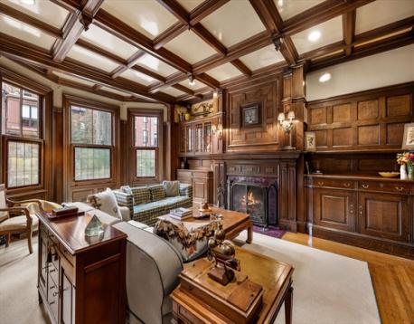Experience the epitome of Back Bay living in this meticulously crafted three-floor residence. Period details harmonize with bespoke customizations for unparalleled elegance. An elegant foyer with a custom-built staircase leads to the formal living room with paneled millwork, 11-foot coffered ceilings, and expansive bay windows. The gourmet kitchen features a La Cornue gas range and Miele/Sub-Zero appliances, adjacent to a refined dining area with custom pantry storage. Upstairs are two spacious bedrooms with high ceilings, fireplaces, and generous custom closets, along with a luxurious bath. The lower level offers a media room, wine cellar, and sunlit guest suite or office with private bath and kitchenette. A Tuscan-style patio with reclaimed stone and a limestone fireplace provides outdoor living, with direct access parking and a private entrance.