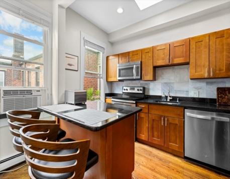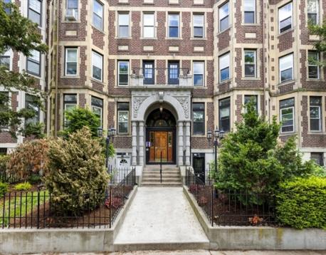 A spectacular one bedroom condo in great location where you can enjoy an urban setting while still being surrounded by green space. This top floor unit features an open style kitchen and living area, hardwood floors, 2 skylights, lots of closet space and high ceilings. The kitchen and baths have been tastefully updated. This wonderful building includes common laundry and bike storage. Conveniently nearby to the Longwood Medical area, Brookline Village, Fenway, E and D Green lines, parks, jogging trails and all that the city has to offer!