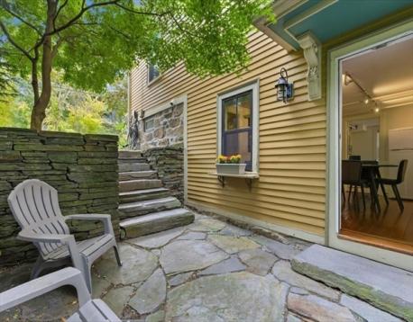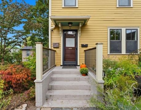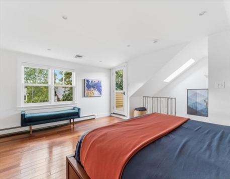 Near Arnold Arboretum, a 3-plus bed, 2 bath single family and 1 bed, 1 bath apartment with parking, blocks to Forest Hills T. Of 1880s vintage and tucked on a gentle hill, its secluded fourth-story deck faces the arboretum. The main house features three levels. The first floor greets with a large living room and semi-open kitchen and dining room. The kitchen, with dining peninsula and extensive storage, opens to a covered deck. The second floor offers two sizable bedrooms, one with an adjacent office or studio, and a clawfoot tub bath. A pass-through room leads to an expansive skylit top-floor primary suite with dressing room, double-vanity bath, and private deck. On the rear garden level, the 375 sq ft one-bedroom apartment has patio entry. Bluestone wraps the rear and side yard, leading up to the driveway with EV charger. On a one-way block in Jamaica Plain’s Arborway area, just 0.2 mi to the arboretum and short blocks to the bookstore, bakeries and cafes of Centre-South Streets.