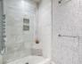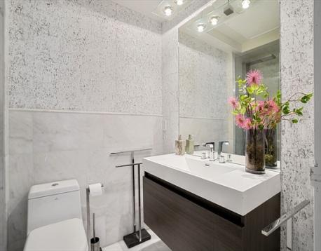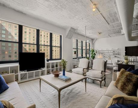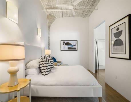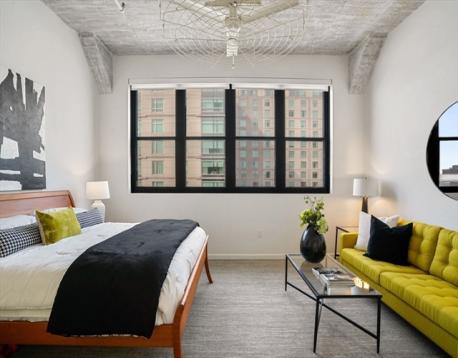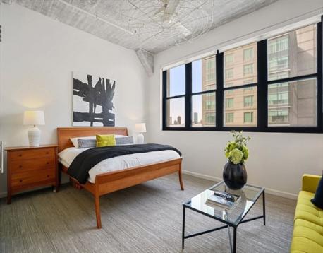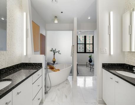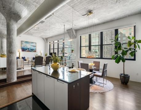 Beautifully renovated two bedroom two full bath front facing penthouse loft conveniently located in the Seaport! With over 1,700 square feet of living space enjoy a sun-filled open living area with separate dining area off the gourmet kitchen with a raised living room. This flexible space is spacious also accommodates an office area. The primary bedroom is luxurious with plenty of room for a sitting area. There are multiple custom closets. The en-suite bath is sumptuous with a separated double sink area, a large shower and a stand-alone soaking tub. The second bedroom is lovely with a large closet and plenty of room for a small sitting area and a gorgeous frosted barn door for privacy. Featuring hardwood floors throughout, numerous windows for optimal lighting, C/A, and direct access garage parking space. The building has gorgeous common areas, elevator, and a roof deck. This penthouse also has the roof rights to a large area for you to custom build the private deck of your dreams.