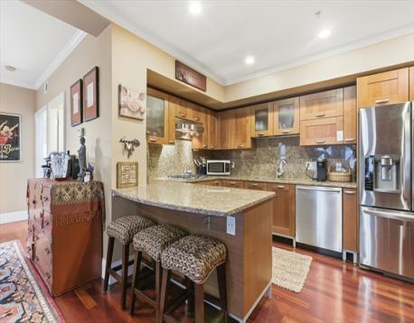 The View is the Thing! Amazing panoramic views from this massive roof deck! Stately & convenient 2BD w/exceptional natural light w/ open exposures. Features incl 1 garage pkg space, gas FP, & exclusive roof deck use space (within/on common roof deck) w/ unobstructed City and Harbor views. Thoughtfully designed open living/dining layout w/ walls of windows, Brazilian cherry HW floors & recessed lighting. Professionally designed kitchen w/ SS appl, gas range, breakfast bar & granite countertops + backsplash. King-sized primary BR w/ corner exposure & generous closet + guest BR w/ good closet space. Bath w/ custom tile, jetted tub/shower & updated vanity. Add’l highlights incl high ceilings, crown moldings & in-unit W/D. Mid-sized, prof managed elevator bldg w/ high owner occupancy, on-site mgmt team & sharp common spaces. Ideally located along the Waterfront’s primary footpath, steps to Downtown, Faneuil Hall, Seaport, Financial District, North End, TD Garden, South Station...