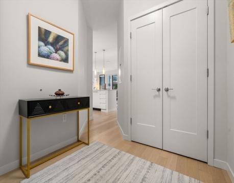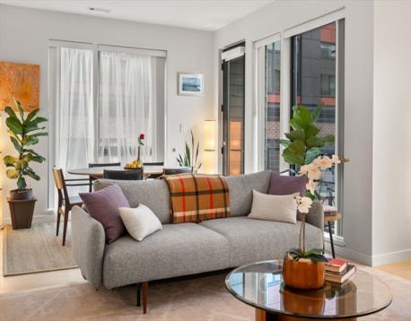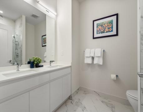 Beautiful & sun-filled 2 bedroom + Office, 2 bath corner residence with private deck and garage parking at highly sought-after Port 45. This thoughtfully designed home welcomes you with a spacious entry foyer and oversized coat closet. The open, airy layout is perfect for both entertaining and everyday comfort. A chef’s kitchen anchors the home with an oversized four-seat quartz island, stainless appliances, gas cooking, tile backsplash, and generous counter space, flowing seamlessly into the dining and living areas. Bedrooms are positioned on opposite sides for optimal privacy, each featuring walk-in closets and en-suite baths. Additional highlights include a large office/den, central A/C and in-unit laundry. Full-service amenities include concierge, fitness center, club room, dog run, bike storage and common roof deck with Boston skyline views—all seconds to shops, dining, public transportation. Don't miss it!