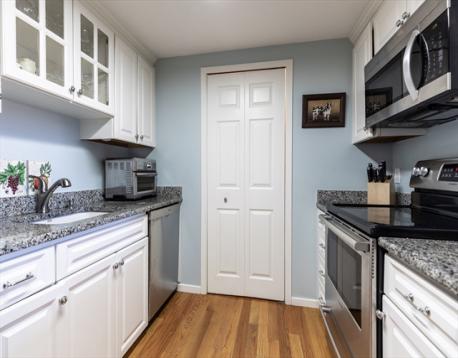 You truly can have it all in this beautifully updated one-bedroom residence with deeded garage parking, in-unit laundry, central air, and a wood-burning fireplace, ideally located in Charlestown’s coveted Gas Light District. Sunlight fills the open-concept layout, with serene views of the courtyard.The kitchen features granite countertops, stainless steel appliances, and a dedicated laundry/storage closet with a washer and dryer. Enter the spacious living area anchored by the fireplace,a bay window, custom shelving and storage cabinets.The generously sized bedroom comfortably accommodates a king size bed and offers excellent closet space.The Courtyard is a professionally managed elevator building with an exercise and common room. Enjoy the beautifully maintained outdoor courtyard with views of Bunker Hill Monument. An unbeatable location just steps to all that Charlestown has to offer, with an easy walk to the North End and quick access to major highways and public transportation.