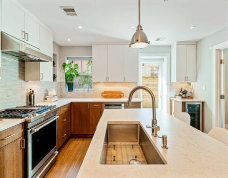Experience refined South End living in this sunny 3-4 Bed, 3 Bath parlor duplex, where timeless design meets modern sophistication. Gut renovated in 2018 by a top architect, this home offers a 2 private entrances, direct access to a deeded parking space, central AC, and a private patio & garden. The chef’s kitchen dazzles with Caesarstone quartz counters, custom cabinetry, wine fridge, and premium JennAir appliances. The open-concept main level features tall ceilings, designer lighting, a gas fireplace, and a sculptural staircase, perfect for entertaining in style. A versatile room with an exposed brick wall and closet offers the perfect space for an office or first-floor bedroom, while a full bath completes this level. Upstairs, the primary suite boasts a custom vanity, walk-in closet, and spa-inspired bath with radiant floors & steam shower. 2 additional bedrooms, one with large front facing windows, laundry, and guest bath with radiant floors & deep jet soaking tub. Prof managed.