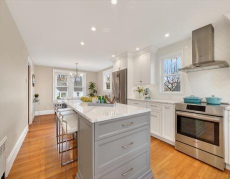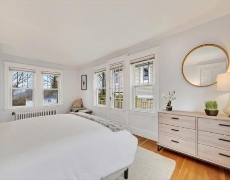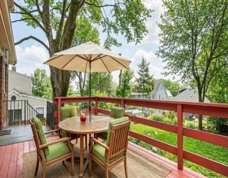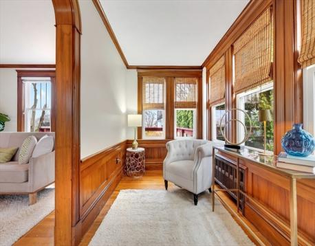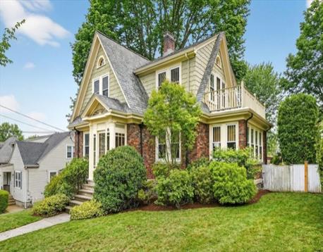 Classic 1930s Tudor top of Peak Hill neighborhood with seasonal skyline views! Period detail with beautiful woodwork, arched entryways and wood burning fireplace with original cabinetry/shelving with adjacent 4 season sunroom. Young and beautiful, open + airy designer Chef's kitchen offering custom cabinetry, spacious island, Quartz Countertops, high end appliances including hood vent, built in microwave, with easy access to deck (with retractable awning) overlooks the expansive fenced yard for gardening and play space! Rare separate exterior entrance from driveway (above grade) to a home office or playroom. Bonus space for all your needs! Conveniently located to Centre Street shops, commuter rail and Holy Name Church and School. First showings Thursday.