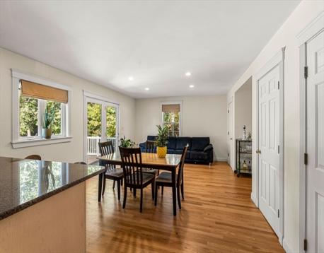 Set on an idyllic dead-end street among the Bird Streets of the Upper Washington St area of West Roxbury, this home offers the perfect contrast of city convenience and suburban tranquility. You'll enter this modern colonial via an expansive wrap-around porch, ideal for morning coffee, and step into a beautiful open foyer. Natural light floods the oak hardwood floors that flow seamlessly throughout the open floor plan, which is complete with detailed moldings and fine finish carpentry. From the gas-fired living room to the kitchen's custom cabinetry and granite counters, every space is thoughtfully finished. The kitchen is adjacent to a large dining area, where patio doors lead out to an oversized deck overlooking a private, woodland backyard. Upstairs, the generous master suite is truly impressive, featuring a cathedral ceiling, a full bathroom, an office nook, a skylight, and a bonus large, finished attic room. The remaining spacious and bright bedrooms allow the natural surroundings.