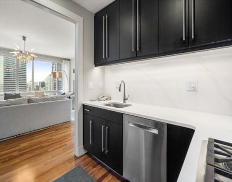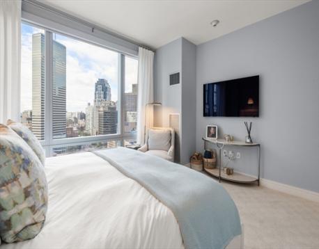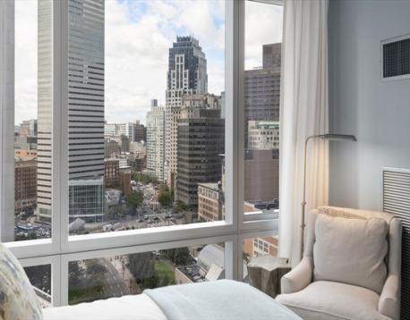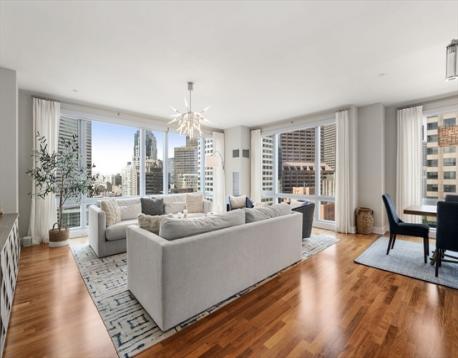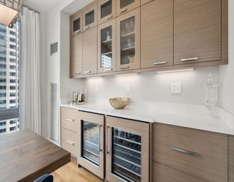 Beautiful corner two bedroom, two bath home at The InterContinental boasting hardwood floors & 9"+ ceilings. Spacious corner living/dining room with custom built-ins, wine refrigerator, floor to ceiling windows, southwest exposure and incredible views! Gourmet kitchen with white quartzite counters, Rosario custom-built cabinets, stainless appliances including Sub-zero refrigerator, Wolfe oven, Franke sink and Asko dishwasher. Master bedroom suite with floor to ceiling windows, en-suite full bath with floor to ceiling limestone, custom mahogany vanity with polished marble tops, oversized shower with frameless glass doors and separate soaking tub, custom walk-in cherry closet. Guest bedroom with floor to ceiling windows and en-suite full bath. Washer/dryer, storage. Amenities include 24-hour concierge, professional management, full-time maintenance, valet parking & fitness center. Available room/maid service, restaurants, hotel services.