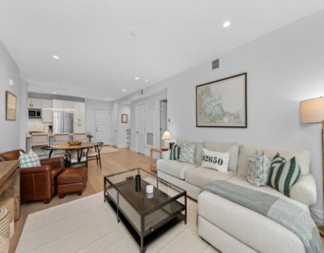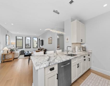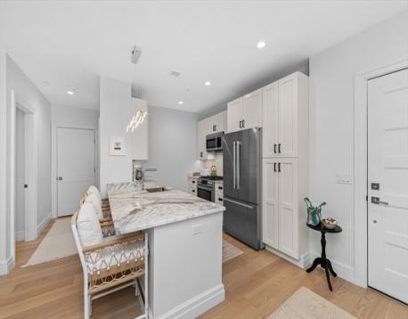 Unit 403 at Vantage Point offers modern luxury living in the heart of South Boston. This new construction residence features an open-concept layout with a designer kitchen complete with two-tone shaker cabinetry, marble countertops, and Bosch stainless steel appliances. Additional highlights include wide plank hardwood floors, recessed lighting, central air, and in-unit laundry. Enjoy private outdoor space, ideal for relaxing or entertaining. Vantage Point is an elevator building with garage parking, professionally managed and ideally located on East 2nd Street just steps to restaurants, bars, shopping, the Seaport, and public transportation.