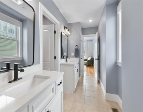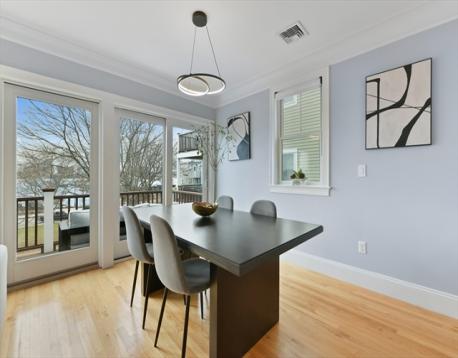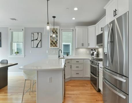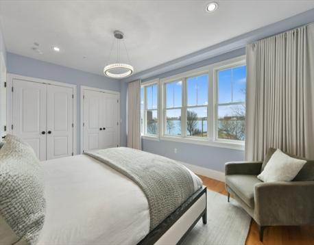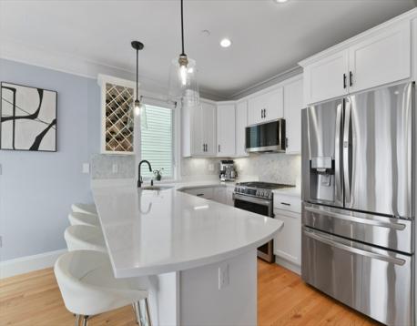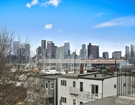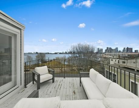 Jeffries Point 3 bed, 2 bath penthouse with sweeping harbor and skyline views! This multi-level home offers deeded parking, private entrances, and 2 private decks with water and city views. The south-facing open main level is highlighted by a gas fireplace, glass sliders leading to a private deck, breathtaking views of Boston Harbor & surrounding greenspace, crown moulding, and an abundance of natural sunlight. A modern kitchen includes stainless steel appliances, quartz countertops, marble backsplash, peninsula seating, custom dry bar with wine chiller, and a walk-in pantry. A spacious guest bedroom and en-suite bath complete this level. Upstairs, the primary suite offers stunning harbor views, dual custom closets, and a full bath with double vanities and water closet. The third bedroom has a walk-in closet and en-suite access. Enjoy a 300 sq ft roof deck with panoramic views! Close to downtown via car, boat, or Blue Line, near Harborwalk, tennis courts, and waterfront amenities.