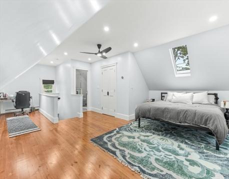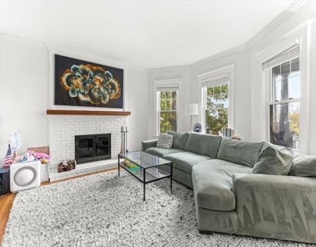 Charming grand Colonial perched above tree-lined street in desirable neighborhood. Updated home featuring classic character with high ceilings, hardwood floors, and crown moulding. Grand foyer leads to large sun-filled living room with mantled fireplace. Large formal dining room includes built-in hutch, five windows, and direct kitchen access. Updated kitchen with stainless steel appliances, Quartzite counters, white shaker cabinets, powder room, and direct access to fully fenced-in backyard and covered deck. Second level includes three large bedrooms, updated full bath, and bonus space with direct porch access featuring sweeping hilltop views. Third floor recently renovated into king-sized primary suite with modern dual-vanity bath, large walk-in closet, and bonus office space. Walk-out basement includes laundry area with washer/dryer, and ample storage. Prime location near 2 commuter rail stops, Roche Bros, & shops/restaurants offering suburban tranquility with city convenience.