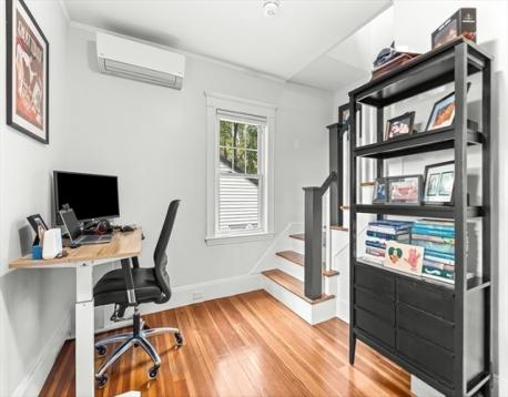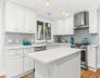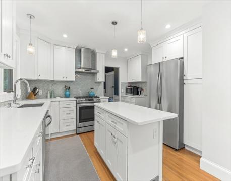 Charming grand Colonial perched above tree-lined street in desirable neighborhood. Updated home featuring classic character with high ceilings, hardwood floors, and crown moulding. Grand foyer leads to large sun-filled living room with mantled fireplace. Large formal dining room includes built-in hutch, five windows, and direct kitchen access. Updated kitchen with stainless steel appliances, Quartzite counters, white shaker cabinets, powder room, and direct access to fully fenced-in backyard and covered deck. Second level includes three large bedrooms, updated full bath, and bonus space with direct porch access featuring sweeping hilltop views. Third floor recently renovated into king-sized primary suite with modern dual-vanity bath, large walk-in closet, and bonus office space. Walk-out basement includes laundry area with washer/dryer, and ample storage. Prime location near 2 commuter rail stops, Roche Bros, & shops/restaurants offering suburban tranquility with city convenience.