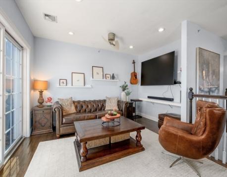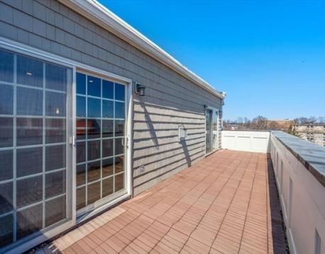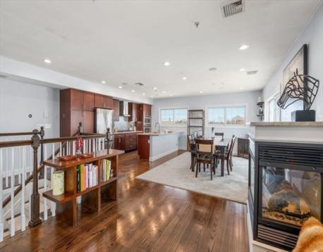 Stunning bi-level penthouse in the highly sought after Popes Hill/Adams Village area offers style and functionality. The entry level features two oversized ensuite bedrooms, creating an ideal layout for privacy and separation. Custom closet systems throughout, including two walk-ins in the primary. This level also features in-unit w/d and a large flex space, usable as a den/office/gym. Upstairs features a dramatic open living area with soaring ceilings and a gas fireplace, this flows into a chef’s kitchen with granite counters, shaker cabinetry, stainless steel appliances, & wine fridge. A private, 500 sq. ft. roof terrace boasts sweeping views of water and city. Additional highlights include gleaming hardwood floors, recessed lighting, & central air. Rare to find 3 parking spaces, including 2 heated garage spots with EV charging & additional storage. Conveniently located near Adams Village and I-93, this home offers an ideal combination of space, convenience, and elevated city living.