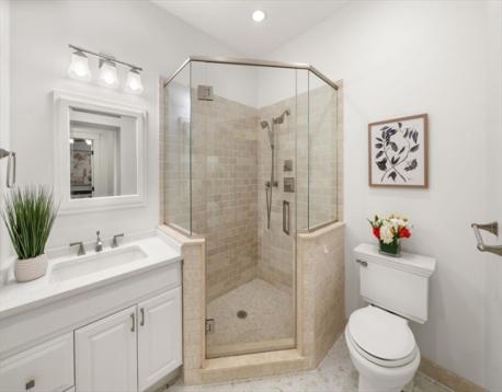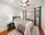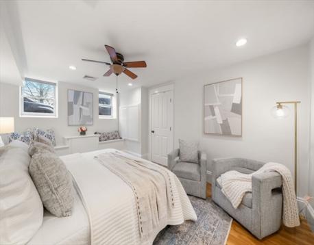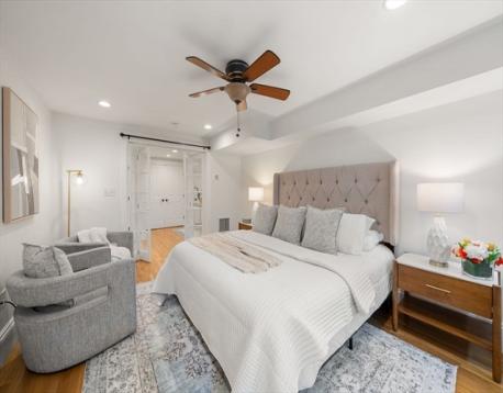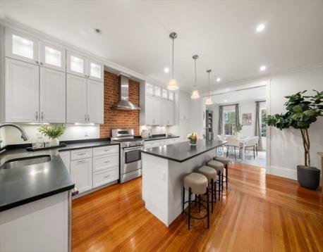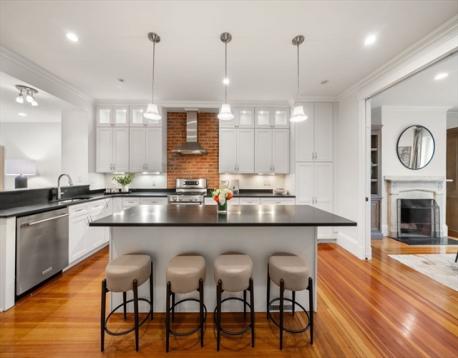 Perched on Training Field Park, this 2+BR/2BA condo is located in a stately brick townhome and offers 1,867sf of well-designed space and a rarely found deep footprint. The main level is well suited for entertaining, featuring an open flow between kitchen, dining and living rooms with glass sliders to an expansive private patio with birch trees and a grill. Soaring ceilings, classic moldings, and a marble mantel with fireplace add to the elegant aesthetic. The white chef’s kitchen features a large center island with bar seating and additional counter seating at the peninsula, which opens to a bright living room. A queen bedroom w/walk in closet, and a well-appointed bath w/shower complete the main floor. The lower level hosts the expansive primary suite with king size bedroom, custom walk-in closet, office area and a spacious bathroom featuring a white quartz topped double vanity, and shower/tub. This level includes a laundry center, great storage, and direct access to Adams St. C/Air.