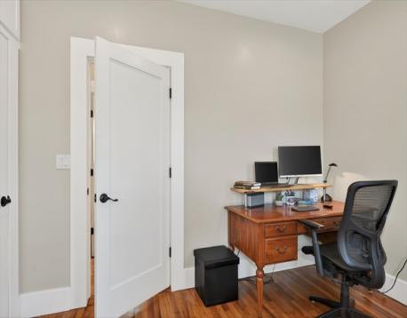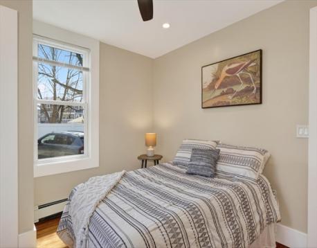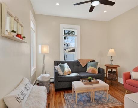 An Urban Oasis in Woodbourne. Discover a rare find: a stunning 3-bed, 2-bath condo tucked on a quiet dead-end street with a sprawling 3,000+ sq ft shared backyard and patio. Step inside to a sun-splashed home fully transformed from top to bottom. Soaring ceilings, gleaming hardwoods, and oversized windows create an airy, inviting feel. The showstopping open-concept kitchen features white shaker cabinetry, a large island, quartz countertops, and stainless appliances — perfect for everyday living and entertaining. The retreat-like primary suite offers a brand-new ensuite bath, while two additional bedrooms provide great space and flexibility. Enjoy peace of mind with extensive building updates including new siding, roof, windows, front porch, blown-in insulation, and high-efficiency heating. Additional perks include in-unit laundry, two deeded parking spaces, and ~200 sq. ft. of private storage. All near Forest Hills, the Arboretum, and JP/Roslindale dining. Your urban sanctuary awaits!