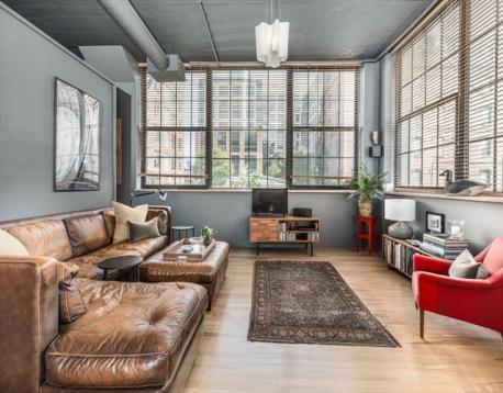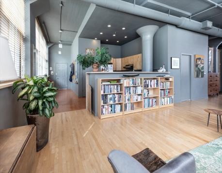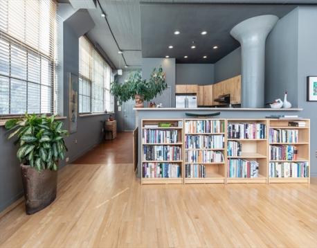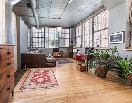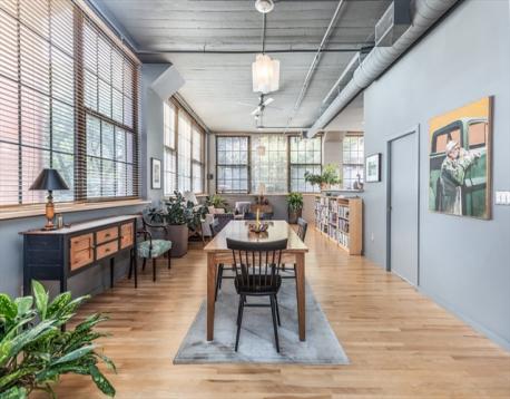 Dramatic true loft style home currently configured w/1 BR but enough space to create a 2nd BR has classic touches such as an open concept living space, expansive windows across three exposures (2016) w/ a view of the community garden, 11 foot ceilings & concrete mushroom columns. The long sunlit entry foyer w/ cork flooring leads to a large eat in kitchen with maple cabinets, granite counters & Jenn-air stainless steel appliances. The front to back sun filled living space offers several zones for formal gathering, intimate dining, relaxing & working from home. The Artemide cloud lights & ceiling fans by Modern Fan Company & maple hardwood floors add sophisticated touches to this home. A spa like bathroom features high end fixtures & lighting, slate floors, 2 designer bowl sinks & walk in double shower w/ marble tiling, glass doors & pebble rock. Walk in closet, washer/dryer, extra storage, common garden & patio. 1 garage parking space offered separately one block away (ArtBlock garage)