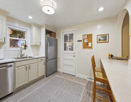 Set on a quiet street, this beautifully maintained mid-century Colonial blends classic charm with thoughtful updates—ideal for modern family living. The main level features a sun-filled living room with sliders to the deck and fenced yard. The updated kitchen opens to the dining room, with hardwood floors throughout. A side-entry mudroom keeps daily life organized. Upstairs, the spacious primary bedroom spans front to back, joined by two additional bedrooms and a full bath. The finished lower level offers flexible space for a family room, office, or guest suite, with a full bathroom and storage. Outside, perennial gardens, patio, and deck create a three-season retreat. Vinyl siding, off-street parking, and a shed add low-maintenance appeal. Just a mile to Hyde Park and Fairmount commuter rail, with bus service to Forest Hills and Roslindale Square. Recent updates include renovated kitchen and baths, gas heating, central air, and insulation—modern comfort in a hidden gem neighborhood.
